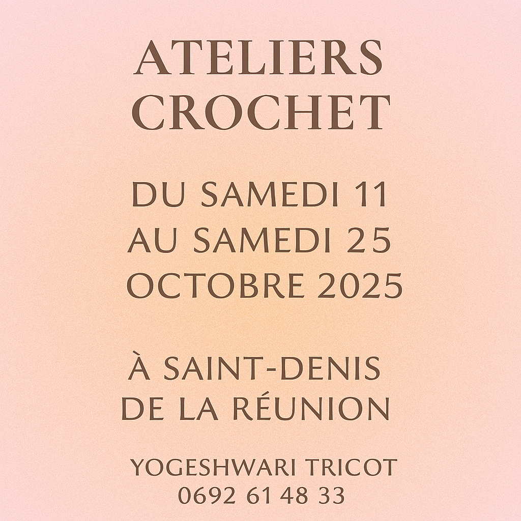 Offrez à votre enfant une première expérience douce et joyeuse du crochet. Cet atelier découverte propose une séance de 3 heures pendant les vacances scolaires d’octobre 2025 à Saint-Denis de La Réunion. À partir de 8 ans – débutants bienvenus – matériel fourni – création textile à emporter.